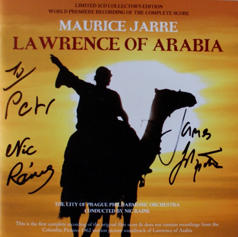 The first CD cover below has been signed by Nic Raine (conductor) and James Fitzpatrick (producer) who brought us the first recording of the complete score for Maurice Jarre's Lawrence of Arabia. The second CD cover has been signed by Maurice Jarre himself. Our thanks to Petr Kocanda for permission to use his collection of autographed CDs. Click a thumbnail below to see the image full size in a separate window.