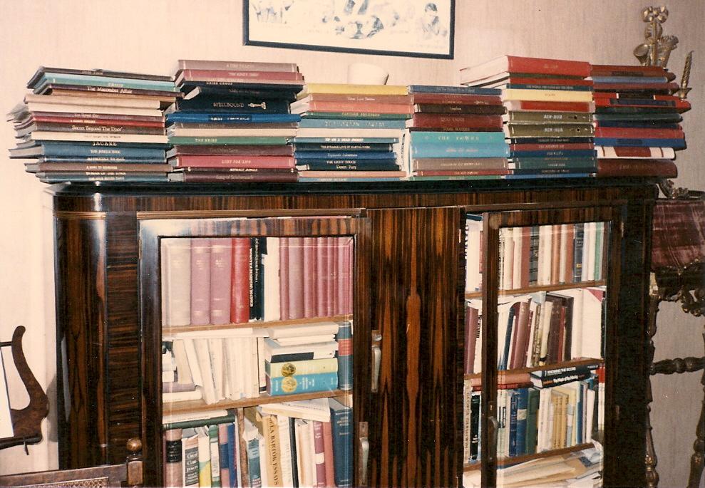 Resting atop this bookcase in the composer's studio are the bound film scores, nearly 100 in number.