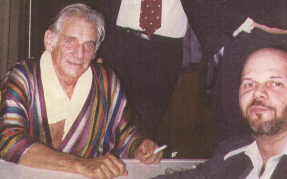 June 6, 1979: The author with Leonard Bernstein (Photo by Marie Dane) The ultimate fate of this instrument, as well as so many other Bernstein possessions, was decided at the Sotheby's, New York auction of much of his estate in early December, 1997, at which I was a bidder. In addition to his pencil-case (replete with pencils of all kinds) and a silver cigarette case he had owned, I had been eager mainly to acquire the multi-colored, striped silk robe that the Maestro often wore in greeting his visitors after his concerts. I have a personally inscribed photo of both of us, in which he is wearing that very robe. The photo was taken by my wife, Marie, on June 6, 1979, after a concert of Schumann (1st symphony) and Shostakovich (5th symphony). Alas, I was unsuccessful in my bidding, but it was comforting for me to know the robe went to a fitting recipient from Germany, a then-student of conducting. By name Anke Weinert-Wegmann, she and I are thankfully still in touch.