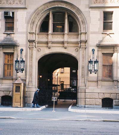 The two arched second-floor windows identify the 2nd-floor Bernstein apartment On the next block, between 71st & 72nd Streets, during the early years of the 20th century, stood the Hotel Majestic. Almost prophetically, it was there that an upper-floor suite was occupied by Gustav Mahler during his first season in New York. The suite in which he lived with Alma and their daughter overlooked Central Park. (Mahler's view of a fireman's funeral prompted the ominous bass drum strokes in the last movement of the uncompleted tenth symphony). It seems providential that a geographical proximity now exists between Mahler and the man who was destined to become the older composer's most exponential interpreter: Leonard Bernstein. Born seven years after Mahler died, Bernstein spent the last 16 years of his own life living in the Dakota -- in an apartment overlooking Central Park.