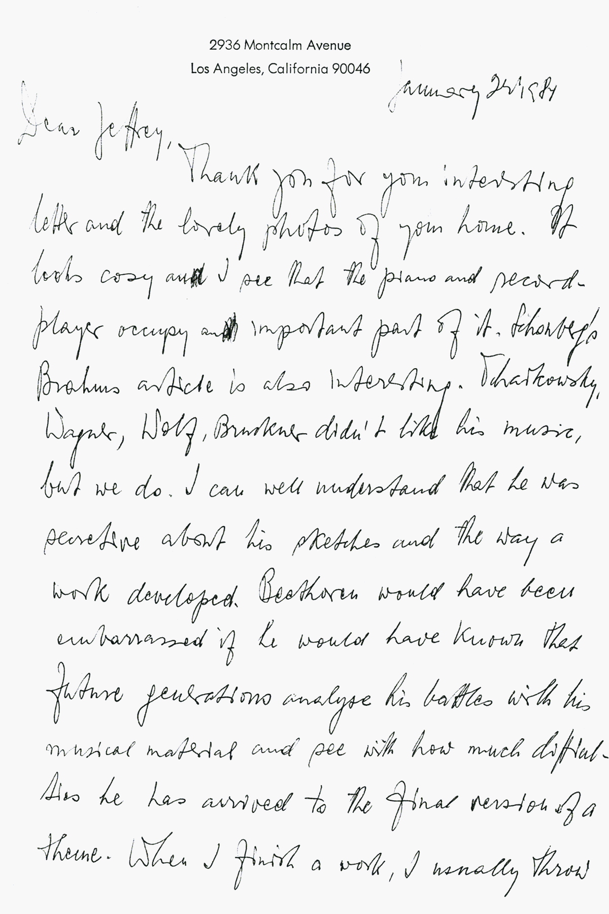 Thank you for your interesting letter and the lovely photos of your home. It looks cozy and I see that the piano and record-player occupy an important part of it. Schonberg's Brahms article is also interesting. Tchaikowsky, Wagner, Wolf, Bruckner didn't like his music, but we do. I can well understand that he was secretive about his sketches and the way a work developed. Beethoven would have been embarrassed if he would have known that future generations analyse his battles with his musical material and see with how much difficulties he has arrived to the final version of a theme. When I finish a work, I usually throw out every sketch because only the finished product matters. I just finished a Flute Sonata. The sketches are still on my desk and I was just about getting rid of them, when your letter arrived. Well, I make an exception and let you have them -- maybe you would like to own them. I am also sending you a Xerox copy of the finished piece, that you can see how I have arrived to it. It is of course still unpublished and unrecorded, so you are the first one to see it.