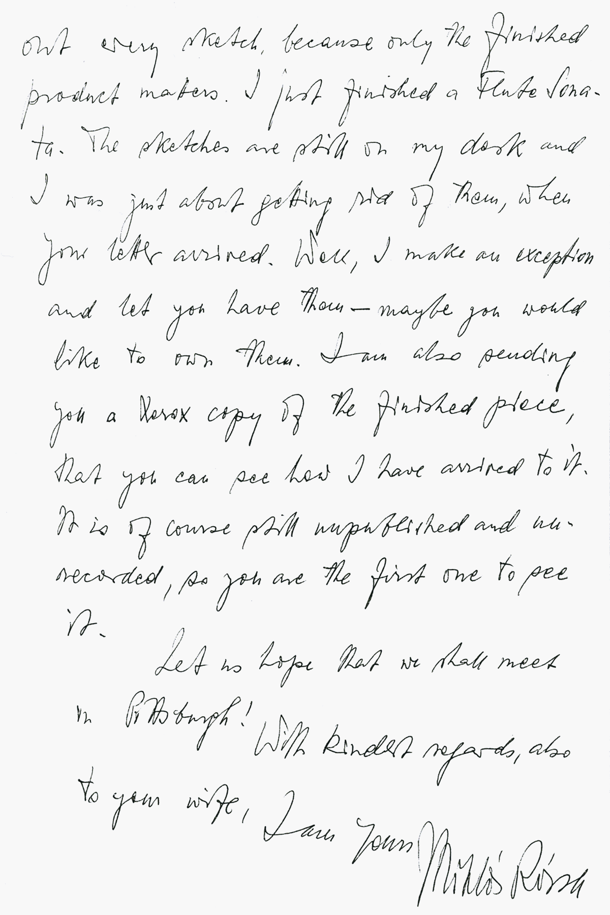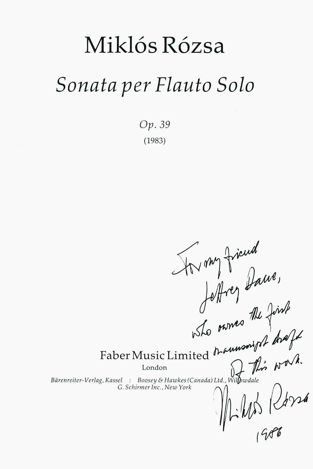 I arrived home one day to find on my desk a large envelope. . . [it] contained his letter quoted above, and a gift from him -- a gift small in physical size but enormous in its substance and significance for me: the manuscript draft of Miklós Rózsa's Sonata for solo flute, op.39. It records the dates of composition of each of the work's three movements: the first, Allegro risoluto, was completed on November 8th, 1983; the second, Andante quasi pastorale, on November 25th; and the third, Vivo e giocoso, on Beethoven's birthday, December 16th.