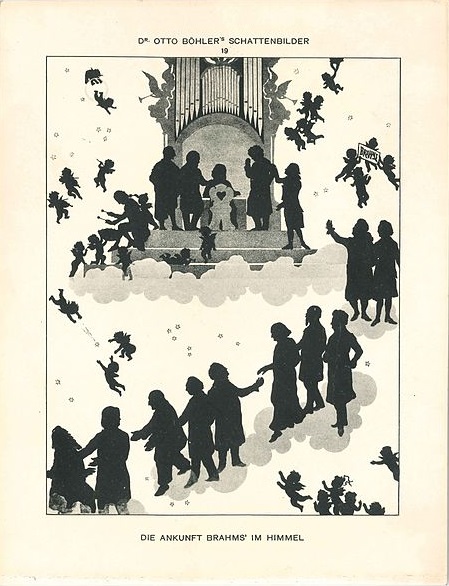 Silhouette by Otto Böhler, representing Johannes Brahms' arrival in Heaven "I can't believe that he actually composed such music." -- Violinist Nadia Salerno-Sonnenberg, about Brahms' Violin Concerto. This begs the question: From whence did Brahms' awesome creative powers come? While the question is rhetorical, the answer is obvious. It seems more than coincidental that the last composition Brahms wrote before his death on April 3, 1897 was a series of pieces for organ, the last of which he titled, O Welt, Ich Muss Dich Lassen (O World, I Must Depart From Thee). It's Brahms' title but God's work. A famous silhouette by the artist Dr. Otto Böhler (1847-1911) literally illustrates his conception of Brahms' arrival in Heaven, being welcomed by Schumann and the others who went before him.